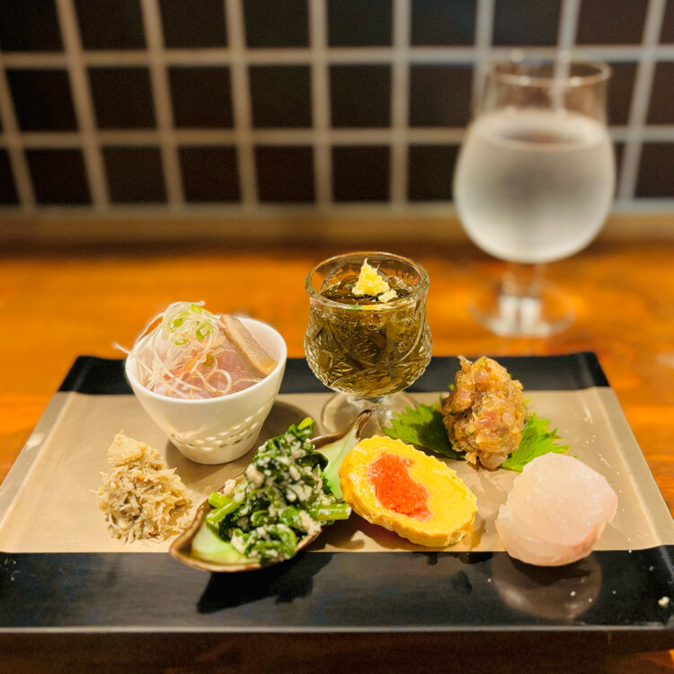 鯵のなめろう・スズキの手毬寿司・ほうれん草鯛の子合え・天然もずく酢・明太子だし巻き玉子・天然鯛しゃぶポン酢・かにみそ合え