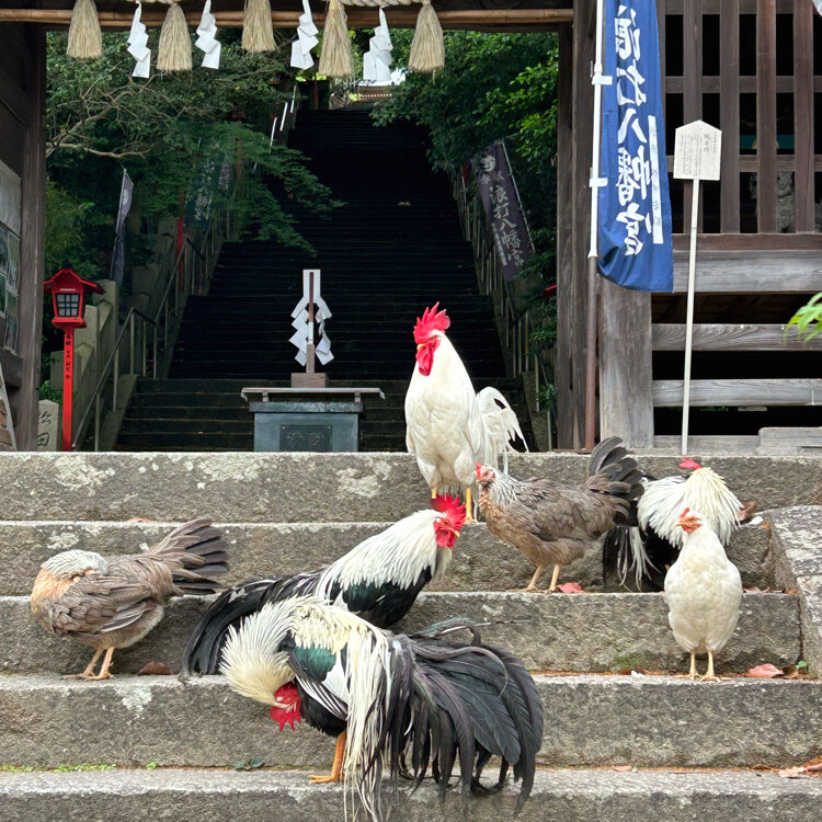 近くの鳥居に導かれて、浪打八幡宮にたどり着くと???尾長鶏がいっぱいで賑やかです🐔<コケコッコ-