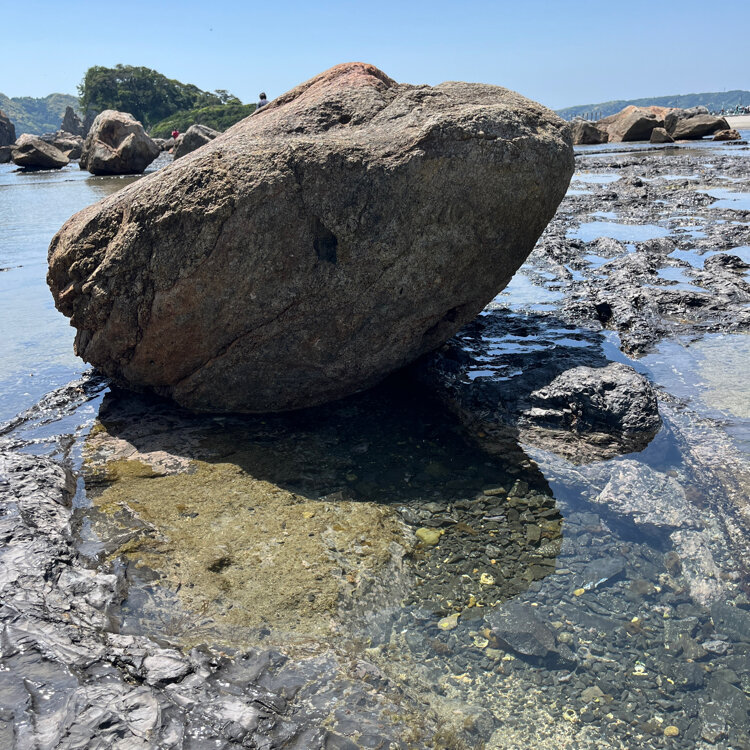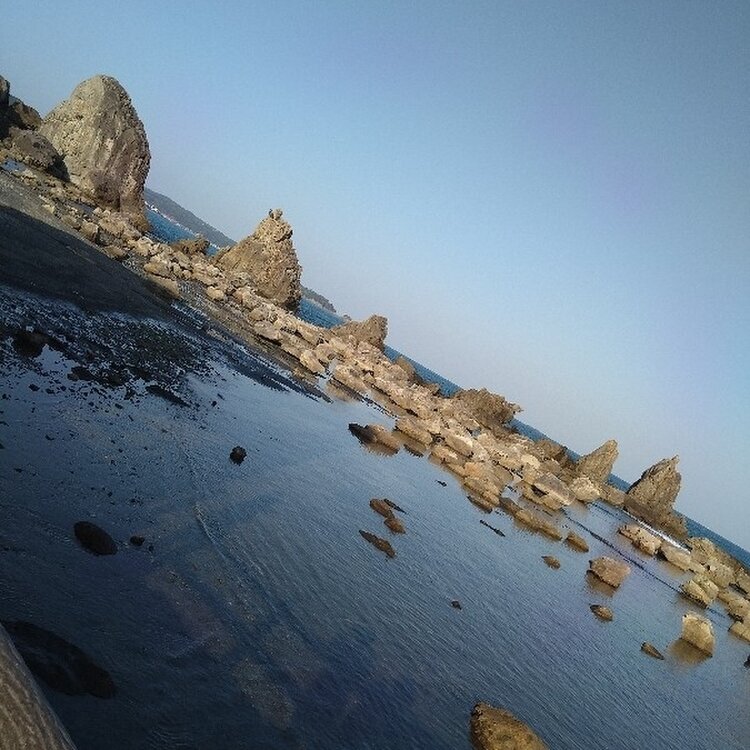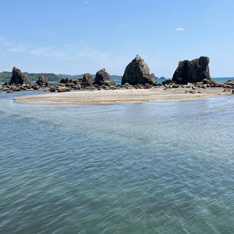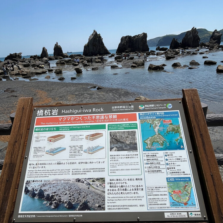 🐟3人de和歌山旅🍊14 大迫力の橋杭岩🪨 ‥ ガイド引用 串本から大島に向かい、海中に約850mの列を成して大小40余りの岩柱がそそり立っています。 その規則的な並び方が橋の杭に似ていることからこの名が付きました。 海の浸食により岩の硬い部分だけが残り、あたかも橋の杭だけが立っているように見えるこの奇岩には、その昔、弘法大師と天邪鬼が一晩で橋を架ける賭をして、一夜にして立てたという伝説も伝わっています。 吉野熊野国立公園地域にあり、国の名勝天然記念物に指定されています。 https://kankou-kushimoto.jp/spots/橋杭岩 ‥ #和歌山 #旅 #串本 #橋杭岩 2025/5/4