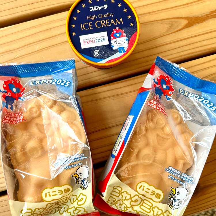 楽しみにしている万博の限定スイーツ。今回はミャクミャク型のもなかにアイスクリームが入った、夏にぴったりの清涼感ある「ミャクミャクもなかアイス」を食べました。バニラと抹茶の2種類有りましたが、残念ながら抹茶は売り切れでした。パッケージには、キュートなポーズのミャクミャクと玉林園(和歌山県のグリーンソフトが有名)のマスコットキャラクター「グリンちゃん」がプリントされていました。