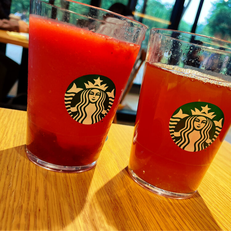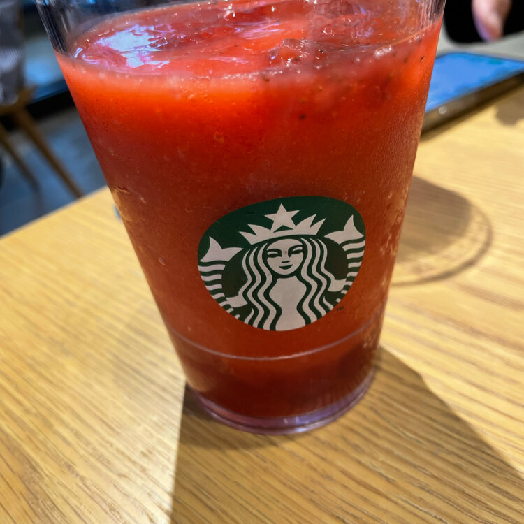 我慢我慢😣苺の🍓スペシャルフラペチーノと友達はさっぱりソーダ🥤を頼んで休憩タイム🩷