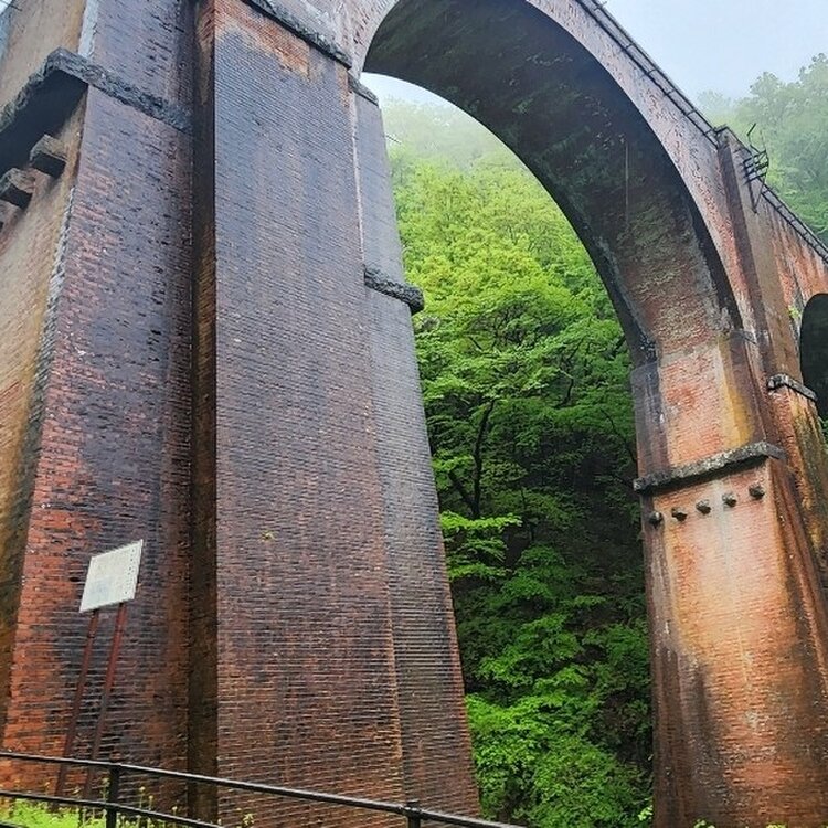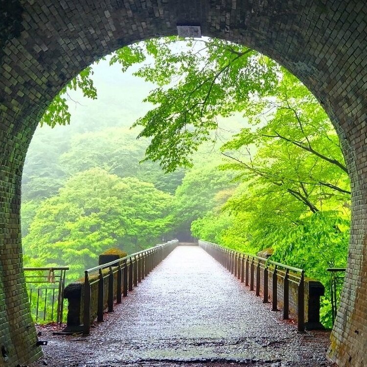 日本一周ドライブ旅(東ルート)の初日に訪ねました。 あいにく小雨が降っていましたが、その分人も少なく新緑が雨で映え、アプトの道のトンネル越しの碓氷第3橋梁(めがね橋)は、まるで一つの絵画のように幻想的で綺麗でした。 めがね橋は、下から見上げるだけでなく、左手の階段を登り、アプトの道のトンネル越しに眺めることをオススメします。