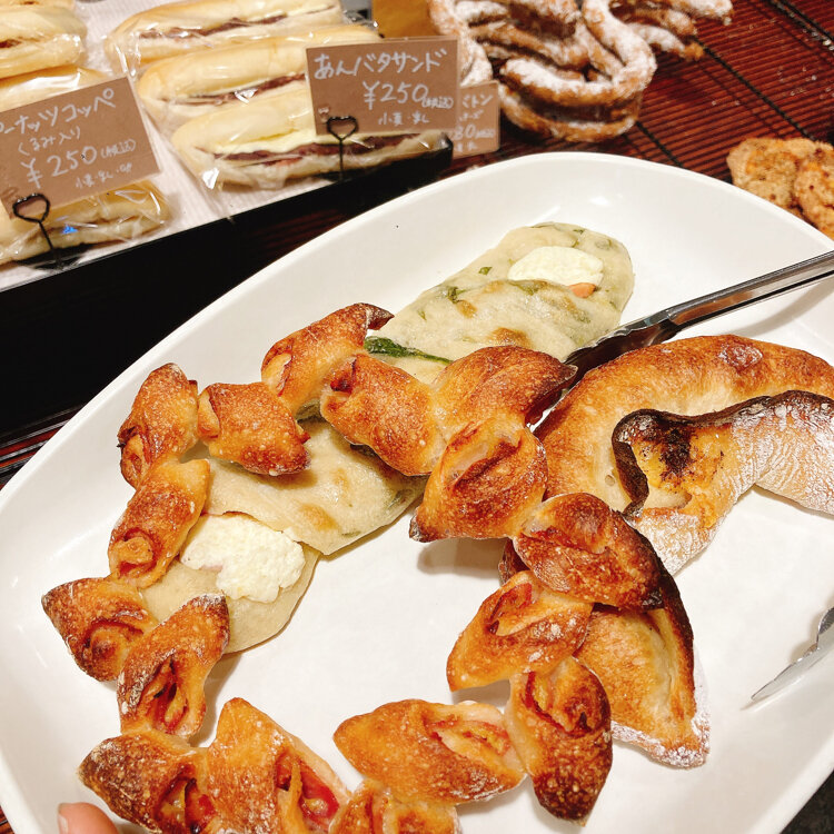 写真はしょっぱい惣菜パンたち、平日限定のサークル型のベーコンエピや山椒を使ったハードパンなど珍しいものも沢山!