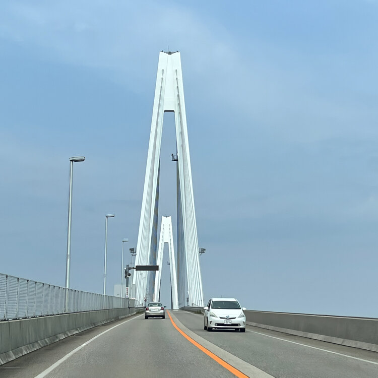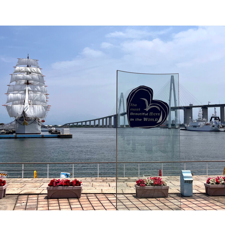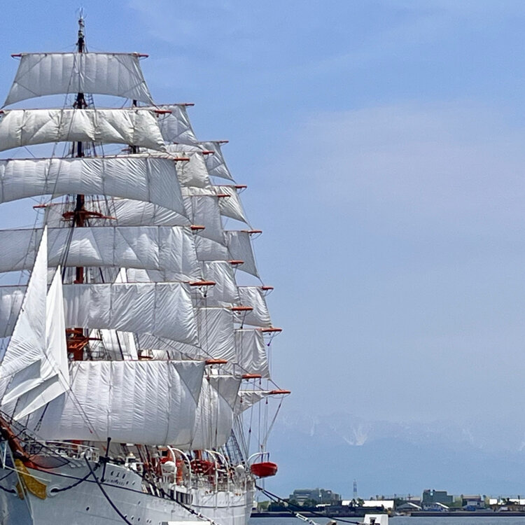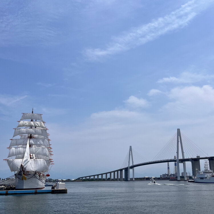 立山連峰と新湊大橋と「海王丸」が並ぶ