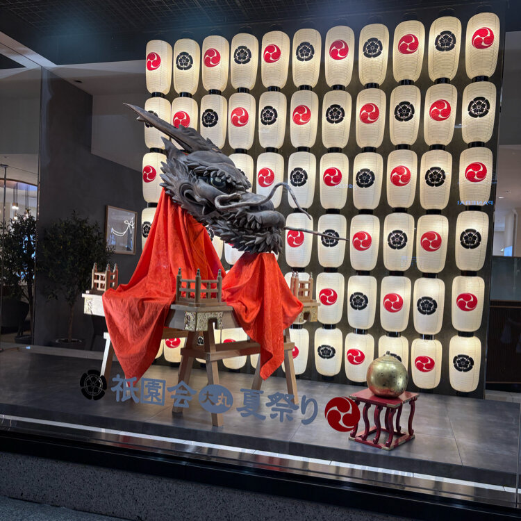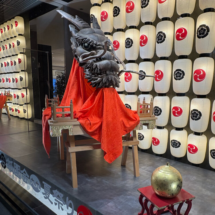 正面口ショーウィンドウには大きな龍の彫刻が🐲大丸創業の下村家より瀧尾神社に奉納されたこの龍彫刻は2016年「大船歩行の龍頭復元」の参考になったものだそうです🐉