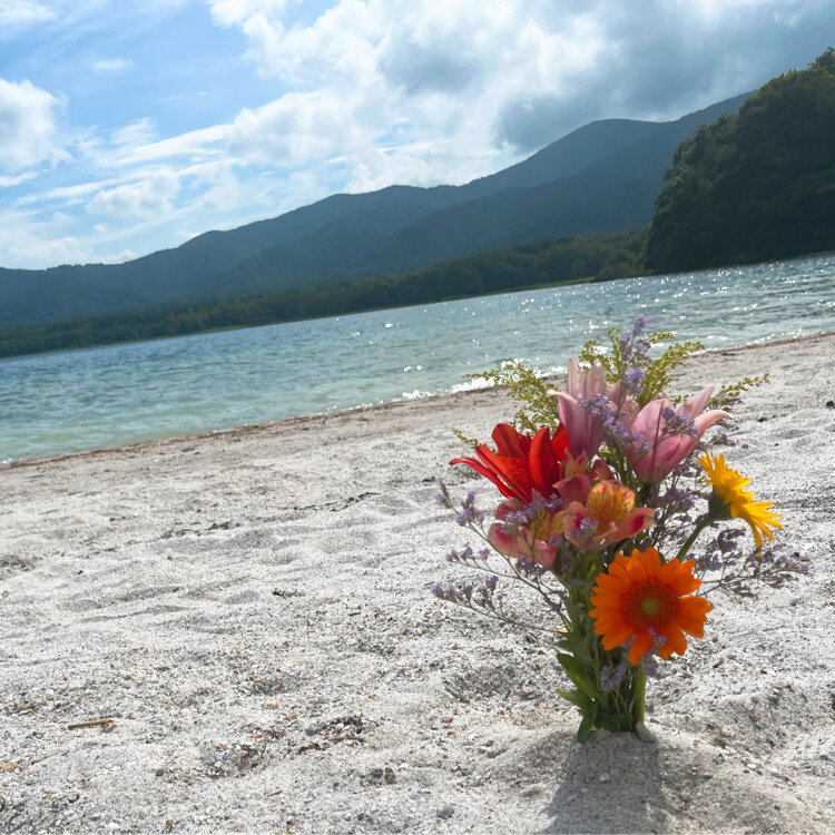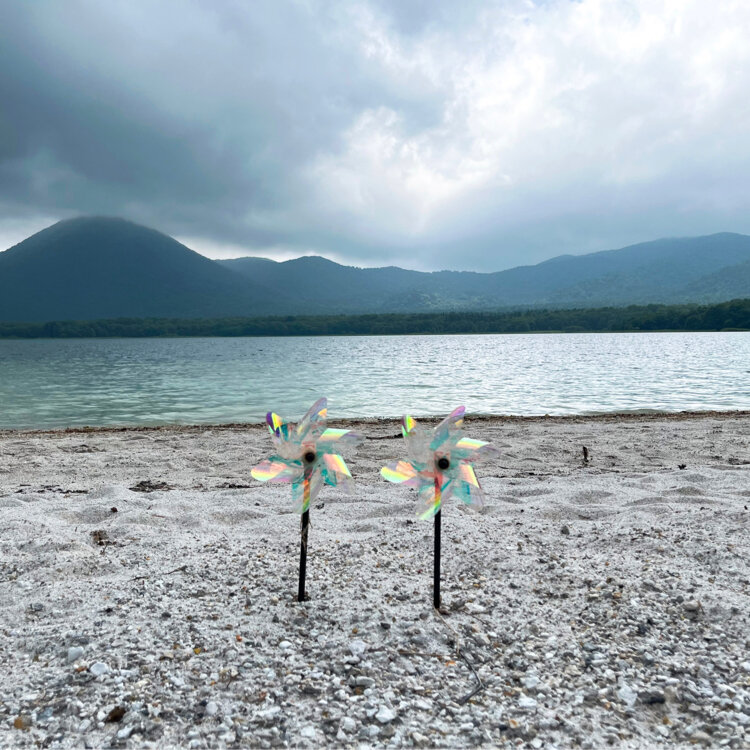 白い砂浜には菊の花や風車が手向けられていて、美しい湖や遠くに広がる山の稜線も相俟って、この世の光景とは思えない不思議な景色でした。本当に極楽浄土のよう。