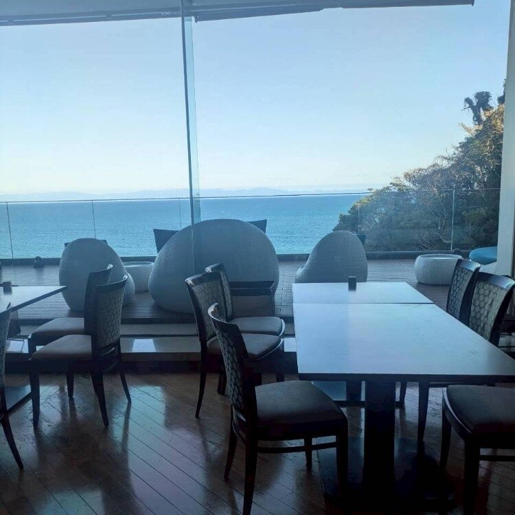 ①オーシャンビューのラウンジは青い海が広がっていて非日常の景色✨遠くには小さく初島も見えます🏝️