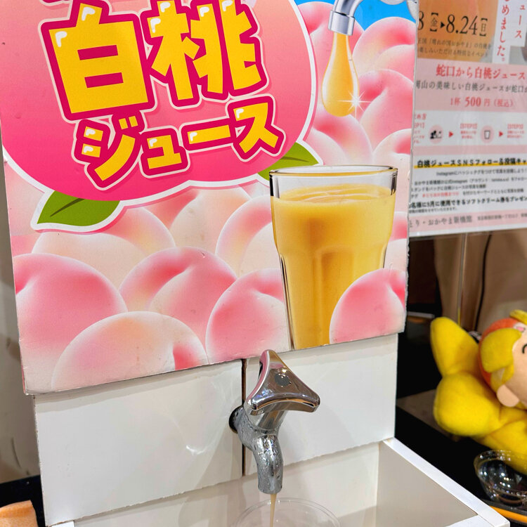 とっとり・おかやま新橋館では、今、白桃の季節限定で『蛇口🚰から白桃ジュース』を販売しています♪