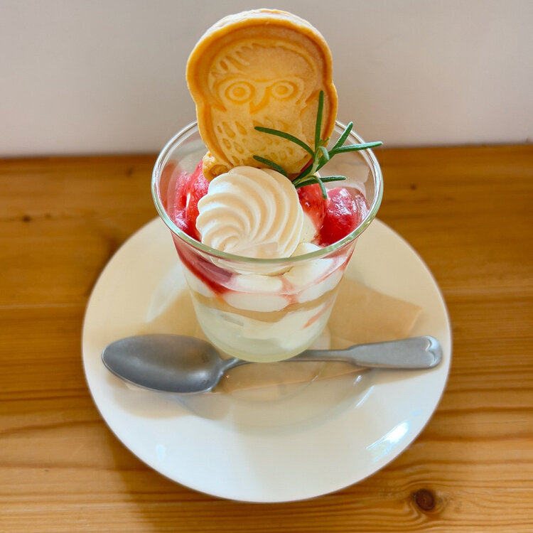 桃と苺のパルフェ。見本の写真のクッキーはリス🐿️でしたが、私のはフクロウ🦉 もしかしたら、色んな森の仲間たちのクッキーがついてくるのかな?