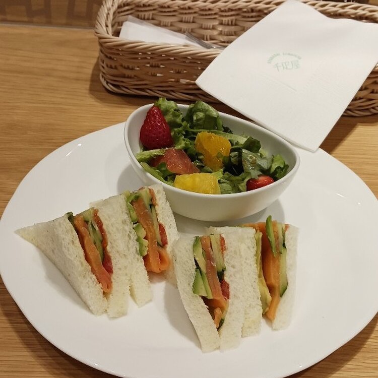 秋のパフェを食べたくて… 大好きな「千疋屋」さん オススメの ハロウィン🎃パフェ おまけに、 サーモンとアボカドのサンドイッチ(ハーフ)とアメリカンもいただきました
