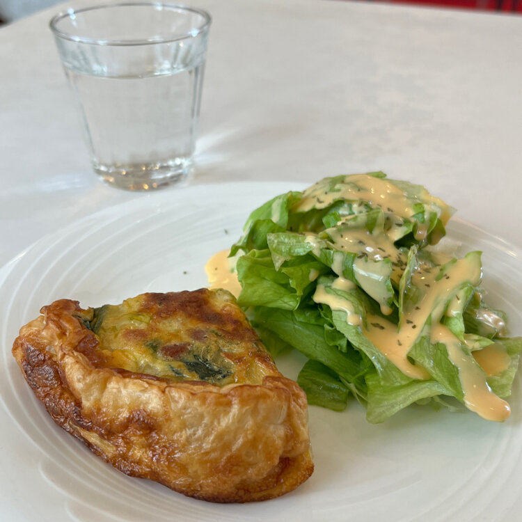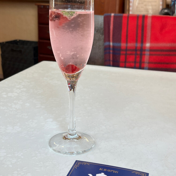 東村山市の空堀川の側にある、紅茶専門店 T78へ行ってきました。 -Rich-リッチ アフタヌーンティーセット 前菜キッシュと3段ラックを楽しめる贅沢セットとのこと。 ウェルカムドリンクのノンアルコールスパークリング(ローズスパークリングソーダ)からスタート🥳 780円のお茶1ポットつきで、差額をお支払いすれば全てのお茶を注文できます。常時78種類以上の茶葉から選べるのですが•••選びきれない🫨www パッとメニューを開いて気になった、ゆっくりと本を読みながら楽しみたいダージリンとディンブラのブレンドとのコメントのある『にじのまど』を選びました😋
