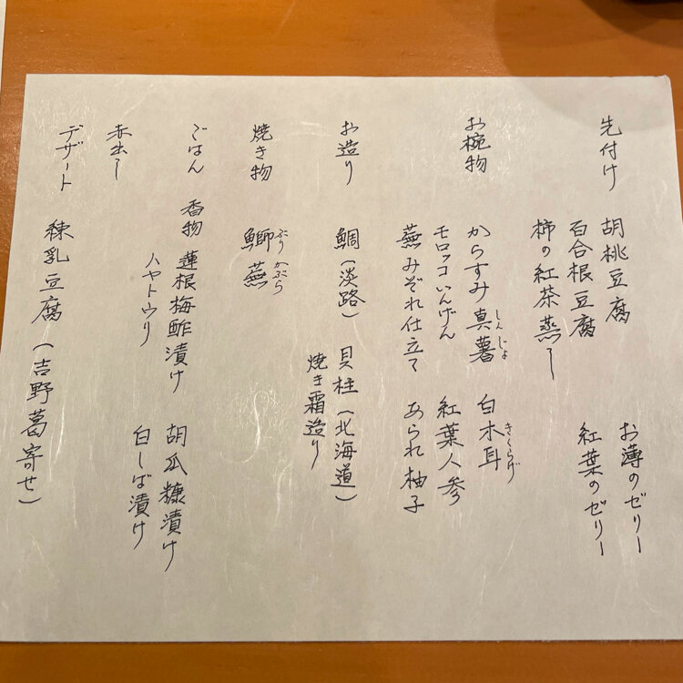 お料理の説明を聞きつつ、すぐ忘れてしまうんですよねなんて話していたので、女将さんが書いて下さいました。