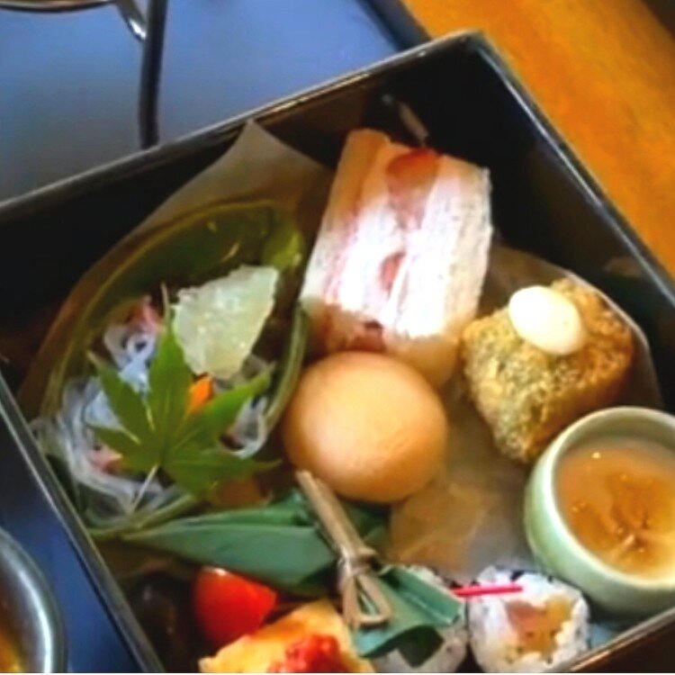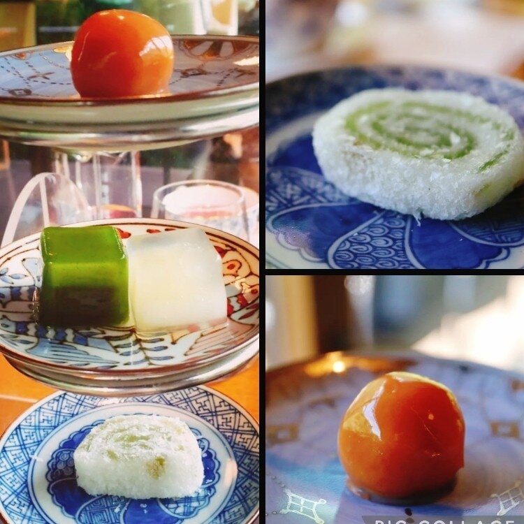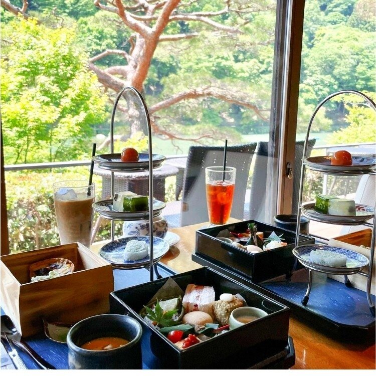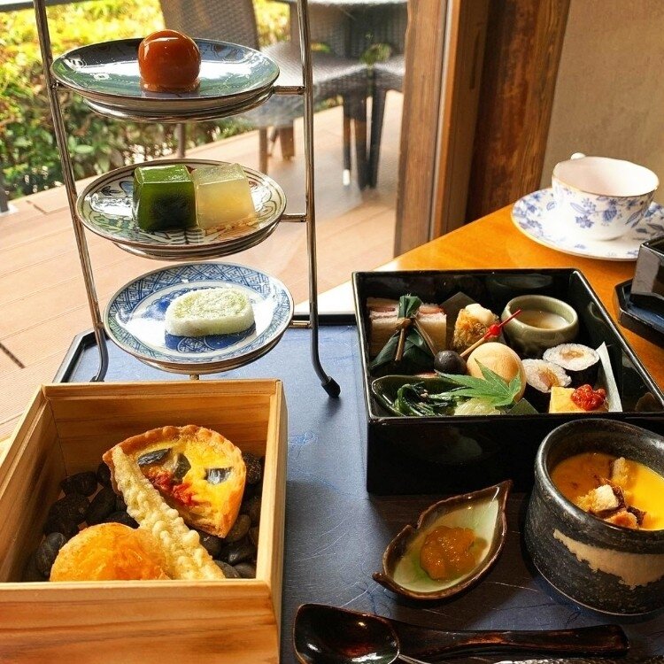 亀屋良長さんの和菓子と、綺麗なお皿のアフタヌーンティースタンド、塗りのお重に入れられた和のセイボリー、そしてお抹茶を始めとする様々なドリンクが程好い量で楽しめます🎵