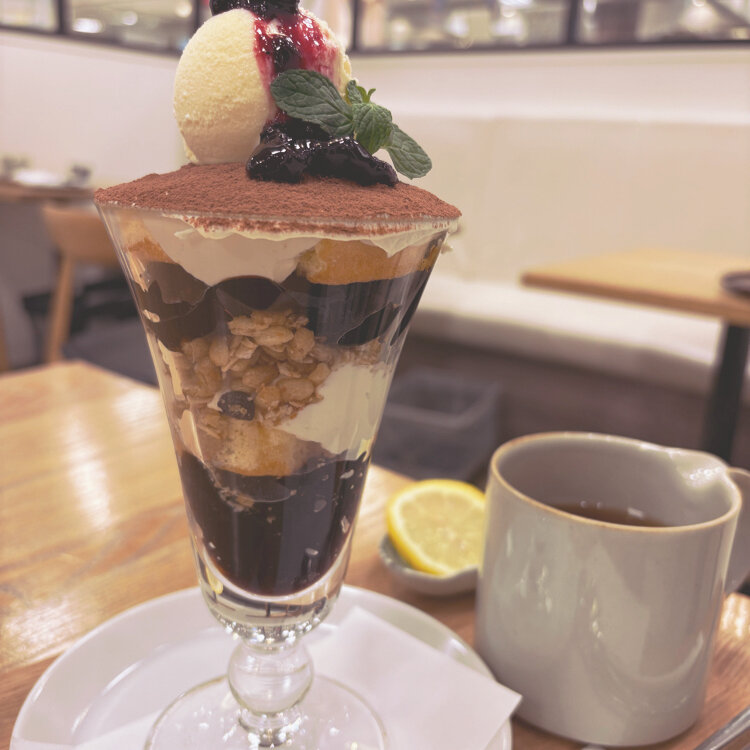 ティラミスパフェ コーヒーゼリーやカカオパウダーのほろ苦さが効いた 大人味のパフェです #幡・INOUE