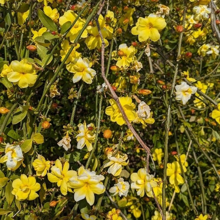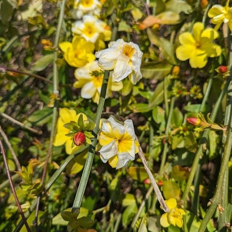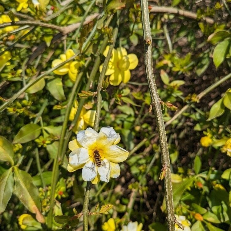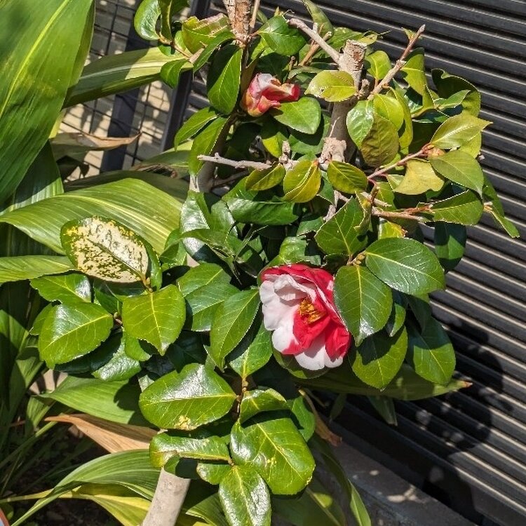 🐝蜂さんが蜜を吸っていました。 オウバイソケイ 紅白椿