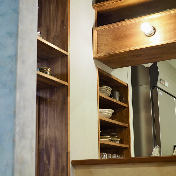 奥の壁に囲まれたひとり席が