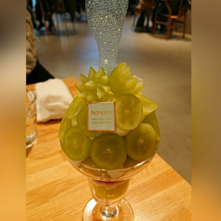 FRUiT 阪神梅田店 シャインマスカットのパフェ お昼お腹いっぱい食べても買い物ぶらぶらしてたら お茶はしたくなるし甘いものは食べたくなる😁 ほぼシャインマスカット!ってくらいのパフェ 食べていくと最後の底にもシャインマスカットが 宝物を見つけたみたいに嬉しい #FRUiT 阪神梅田店