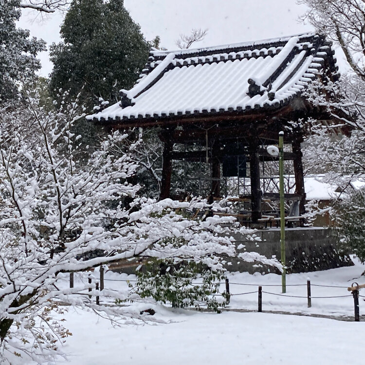 雪の六角堂と新風館❄️ 北区の金閣寺の大雪とは違い、烏丸御池まで来るとうっすらです。 スタバ烏丸六角店から見た六角堂。