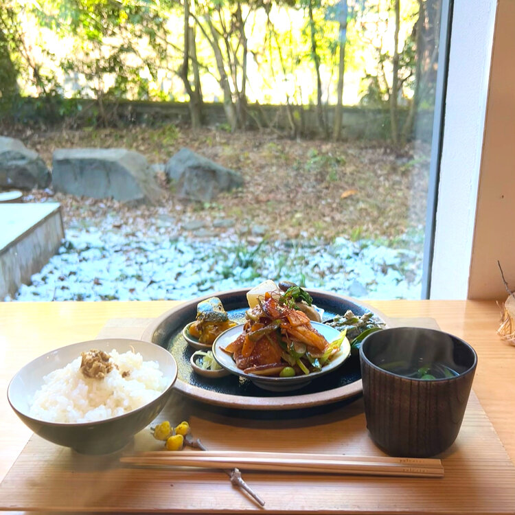 今日の目的は2階の食堂へ日替わりランチを食べに行くこと🍚。大好きだった喫茶が閉店し、新しく開店したと聞いていましたが、なかなか行くことができずやっと行くことができました。今日の日替わりランチは唐揚げ、豚肉、油淋鶏から選べ、私は油淋鶏にしました。煮物、和物、お味噌汁、お漬物、ご飯‥そして、目の前はこの景色🌳大満足でした☺️また、疲れたらこの景色を見にこよう🌿