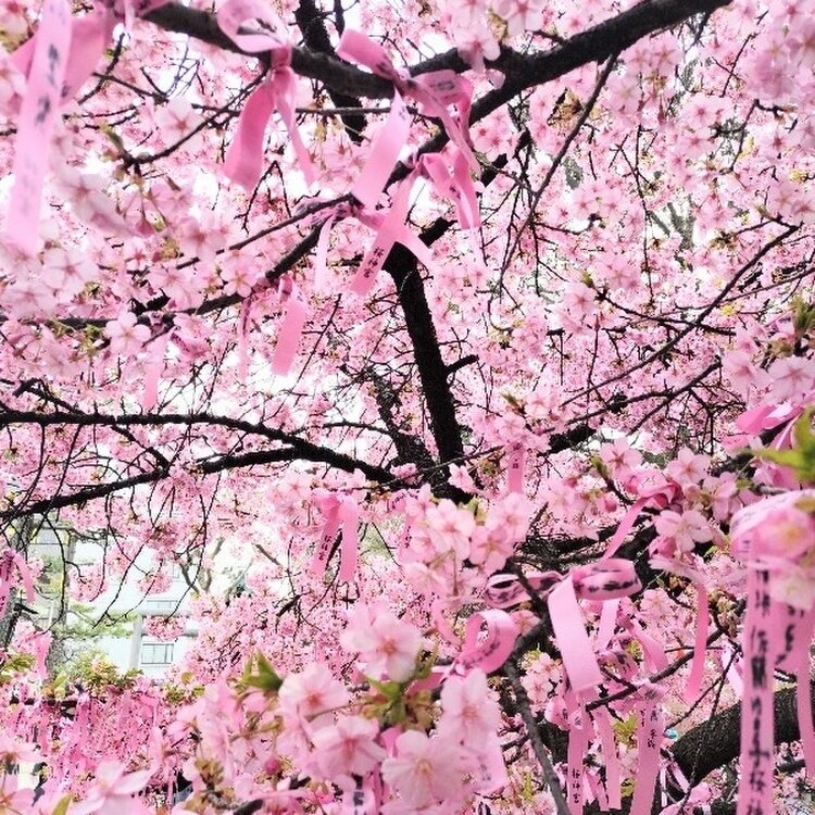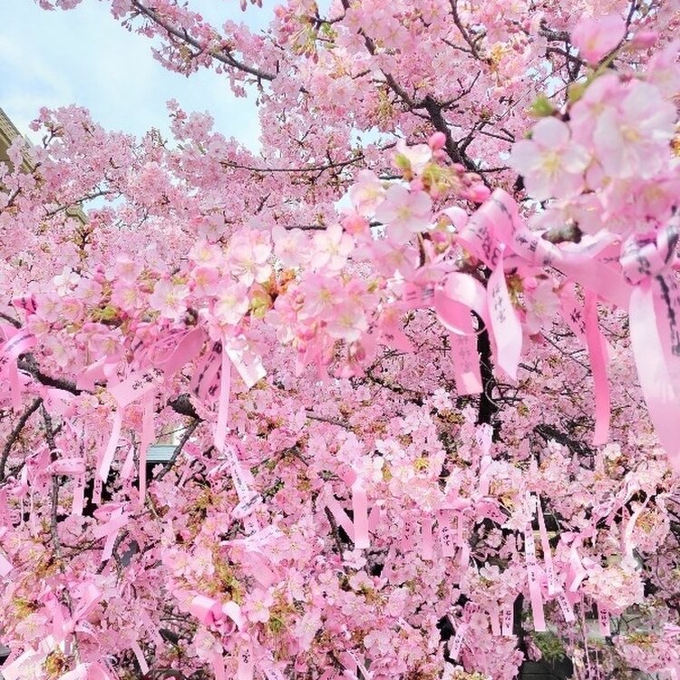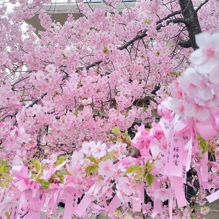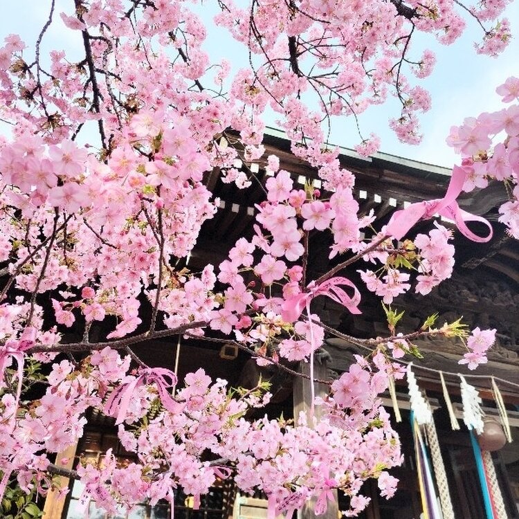 桜神宮🌸① サザエさんの街、桜新町にある河津桜の名所🌸 満開のタイミングに行けました🤍🤍 ピンクのリボンがめちゃ可愛くて。。境内は桃色で華やぎ春めいてました😊🌸