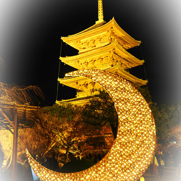 🌙🎍月回廊✨💫東寺˙ ✩゚˖🐏🌙⋆。˚꩜ 2月11日から開催中の東寺月回廊。 まずはパンフレット表紙にもなっている月と五重塔の写真から。 世界遺産・東寺に現れた、光の月です🌙 5枚目は夕暮れの五重塔です。 #開運旅 #東寺 #教王護国寺 #月回廊 #東寺ライトアップ #京都夜景 #京都イベント #五重塔 #京都観光 #京都 #ことりっぷ京都 #幻想的な景色 #光のアート