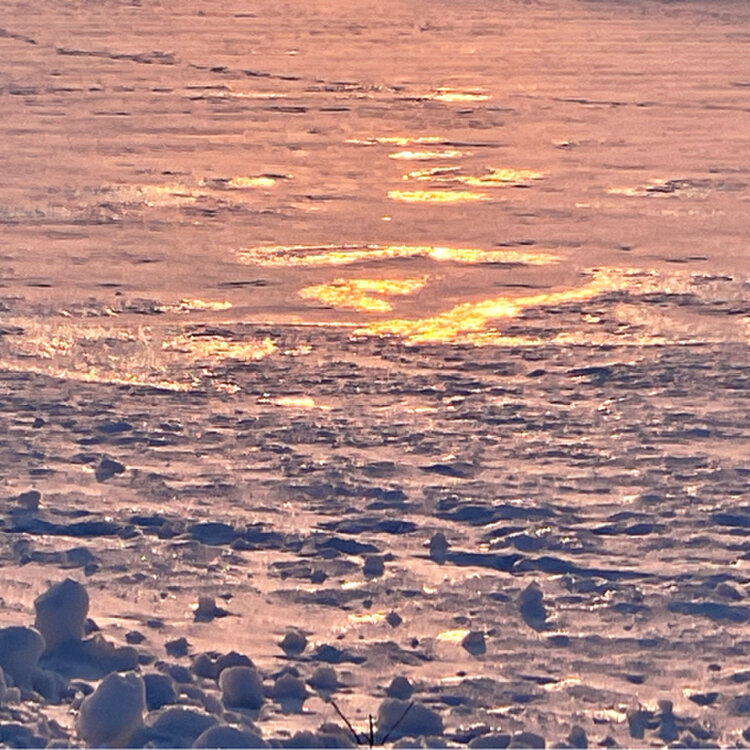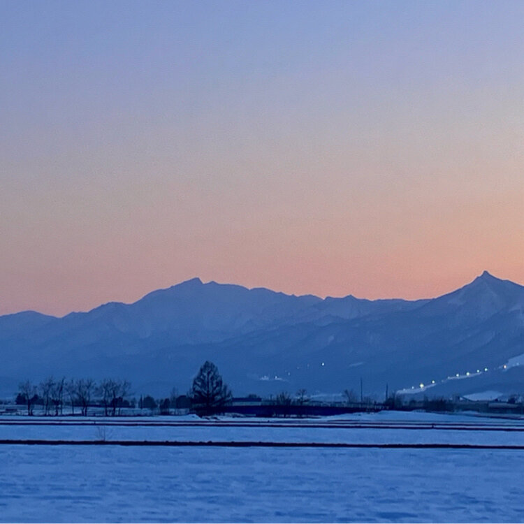 春へ向かう〜夕 十勝岳連峰を照らしていた夕陽が西の空に沈みました 田園の街を挟んで反対側は『芦別岳』と『富良野西岳』 美しいブルーのシルエットの山並みと その向こうのオレンジ色が残る夕空の終わり ほんの僅かな時間の美しさです ブルーのシルエットの山並みに光るのは 『富良野スキー場』のナイター照明です この他にも… 麓には新富良野プリンスホテルやニングルテラス 上御料の一本桜もこの山並みの麓に位置します 早朝には…この田園の街の上を熱気球が浮かび上がり 空中散歩を楽しめます #ことりっぷと一緒 #ことりっぷ富良野・美瑛・旭川 #ひみつの絶景北海道 #山のある風景 #冬景色 #美しい空 #ブルーアワー #夕空 #芦別岳 #富良野スキー場 #田園 ② 解けかけて氷のようになった雪原に沈みゆく夕陽が反射して光りました