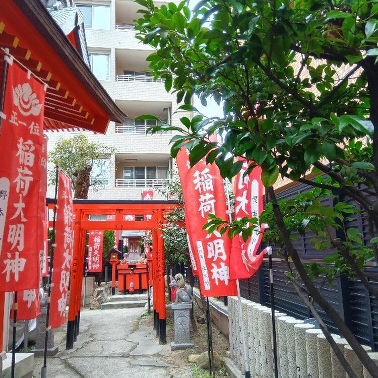高いマンションの間に細長く神社があるとは・・