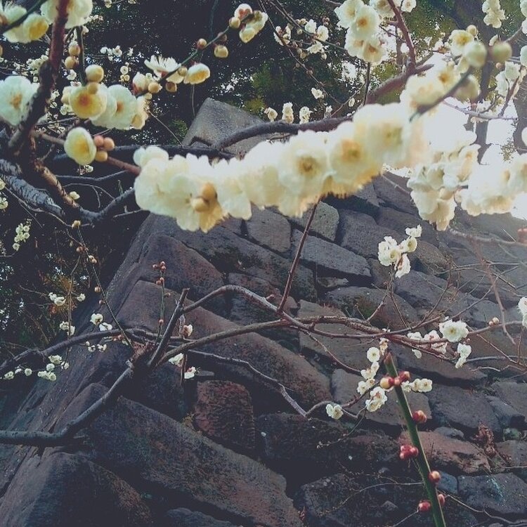 渋い色を放つ城の石と梅の花を撮影したくて💓