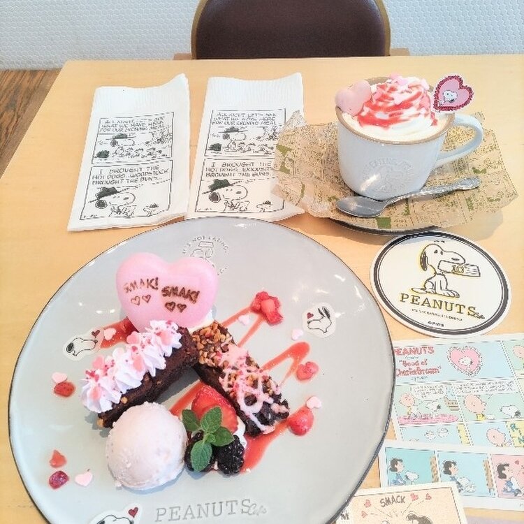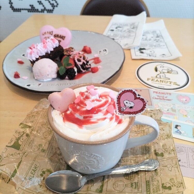 スヌーピーのお皿にハートが散りばめられてピンク色が可愛すぎました🥰💕濃厚なブラウニーは甘酸っぱいいちごソースがアクセントでハートのカリカリ食感が楽しい♡優しい甘さのミルクティーは生クリームたっぷりでした♡南町田グランベリーパークは都内住みでも地味に遠い😂だけどスヌーピーに囲まれた可愛い空間で思い切って行ってよかったなと思いました🥹💕あ〜♡可愛かった🥰
