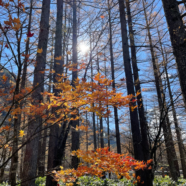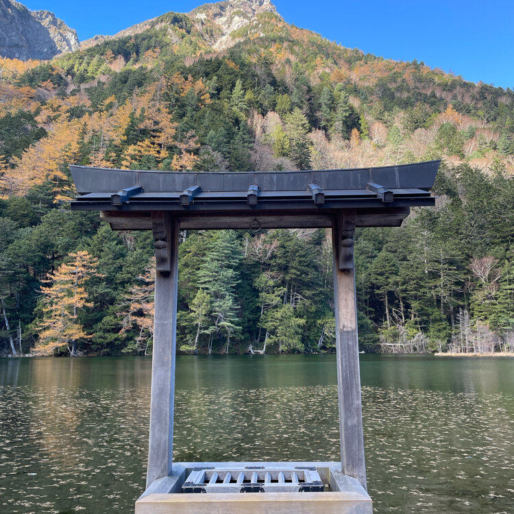 冬復活の上高地キャンプ🏕️☃️③ 穂高神社奥宮様にお参り⛩️ お参りした時には見えていなかった青空が帰り道に見えてきて、これはこのまま帰ったらもったいない!と急遽バスの予約を遅らせて再度参拝。 その2巡目の景色です。 くまなく満喫しました😊✨