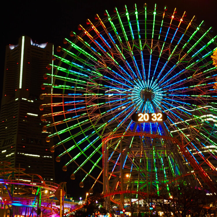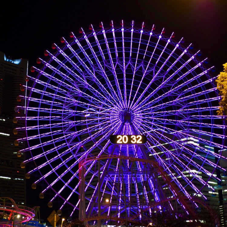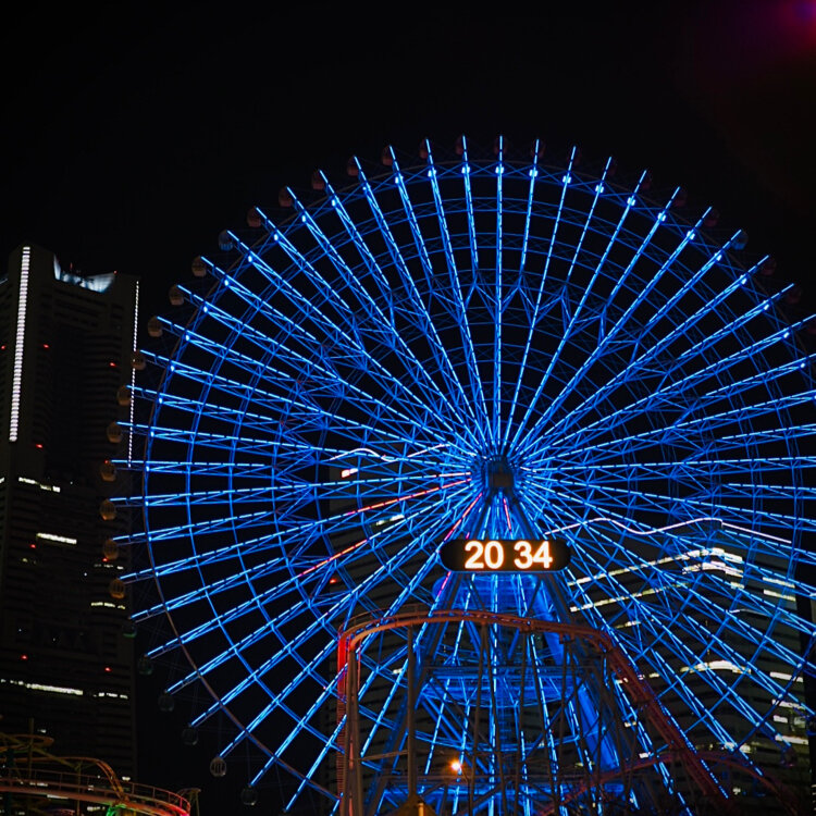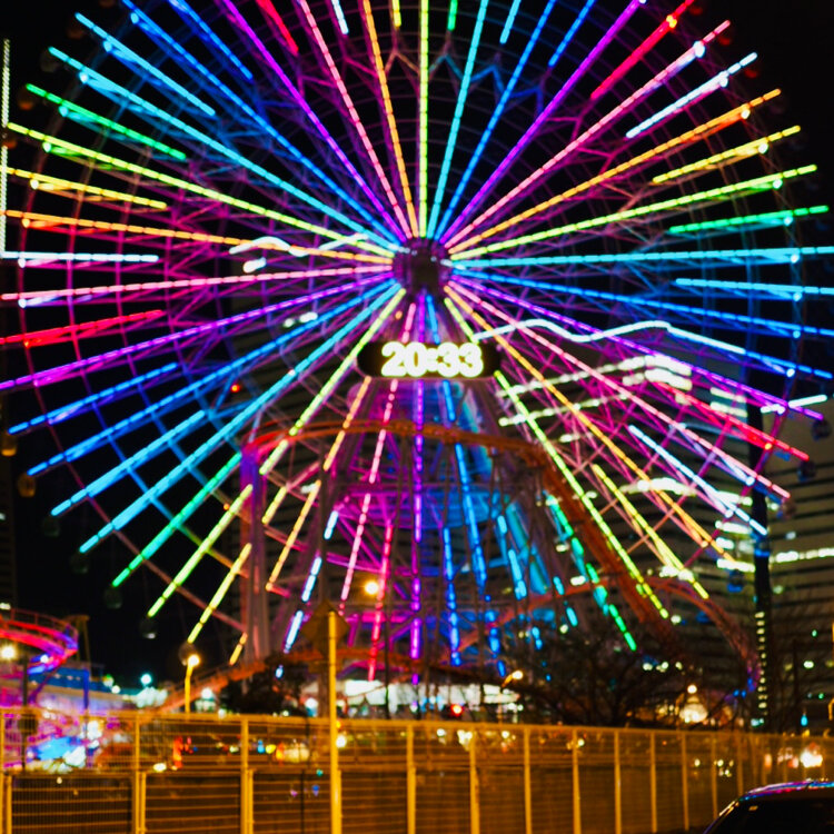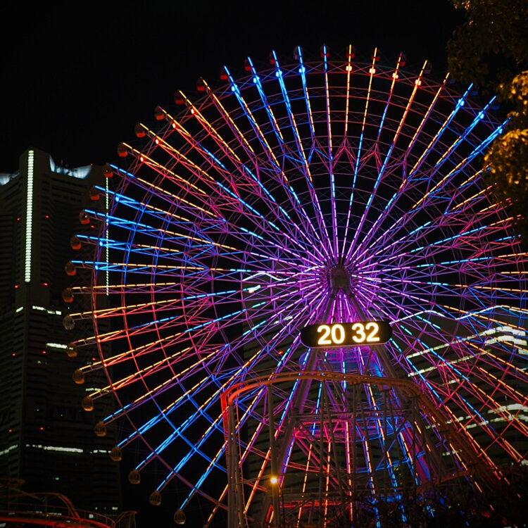 .*✰⋆。横浜ハンマーヘッドパーク③。*☽:°⋆。 宝石箱みたいな色とりどりの光があふれる横浜みなとみらいの夜。ハンマーヘッドパークの駐車場からも、華やかな観覧車がみえました(^^)