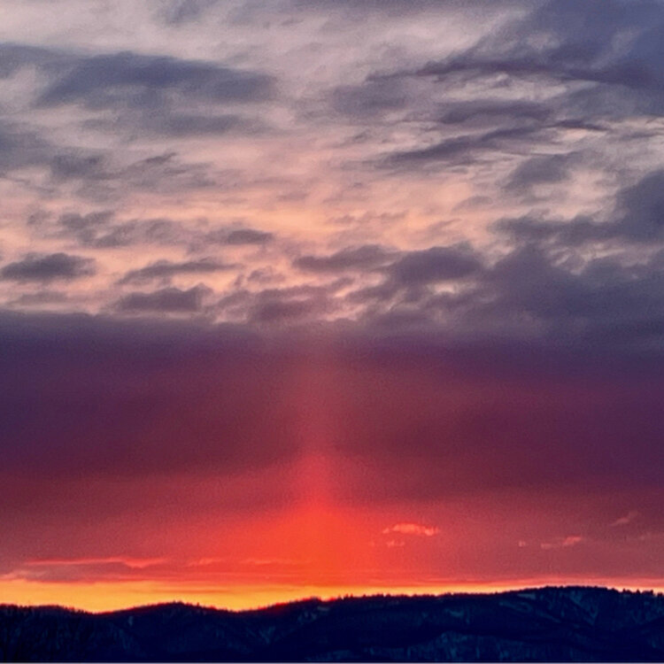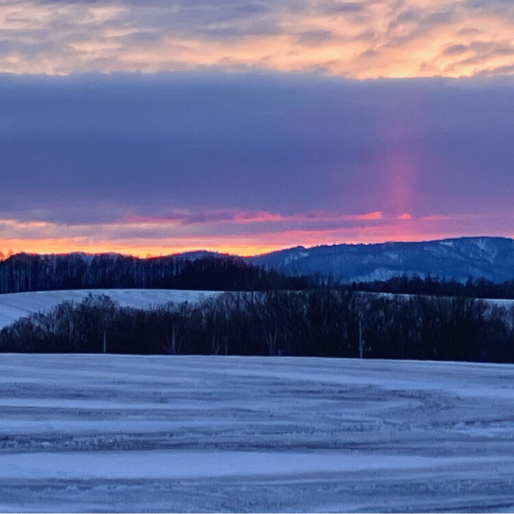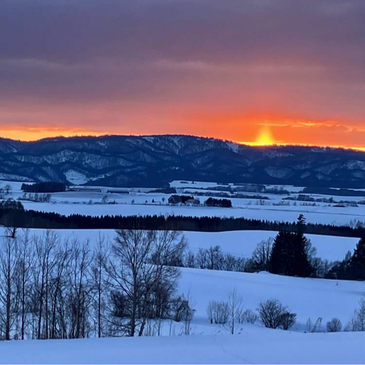 沈む夕陽は氷の結晶に垂直に反射してサンピラーを見せてくれました