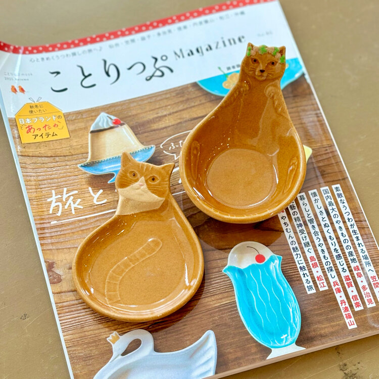 #ことりっぷ栃木 #栃木 #益子 #益子焼 #よしざわ窯 #出張ショップ #仙台に来てくれてありがとう #キャメル色花冠をした猫のおしゃもじ皿 #振り向き茶トラ猫 #楕円皿 #ありんこさんのおしゃもじ皿のお仲間いたよ! #携帯写真 #fumitubu #ふみつぶ〜ぬ #22日はねこの日 #3月22日 #ちいさな列車旅