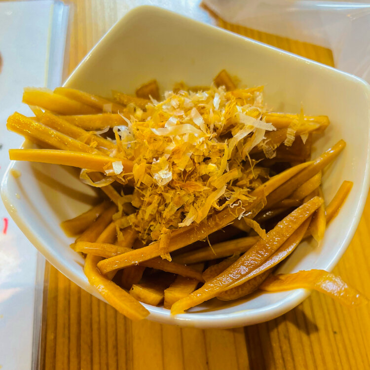 サービスです」💦ときんぴらを持ってきて下さいました☺️ありがとうございます⭐︎腹ペコ男子の目がピカリ👀!とりあえず、ガリも別皿に出して少しお腹に入れました。