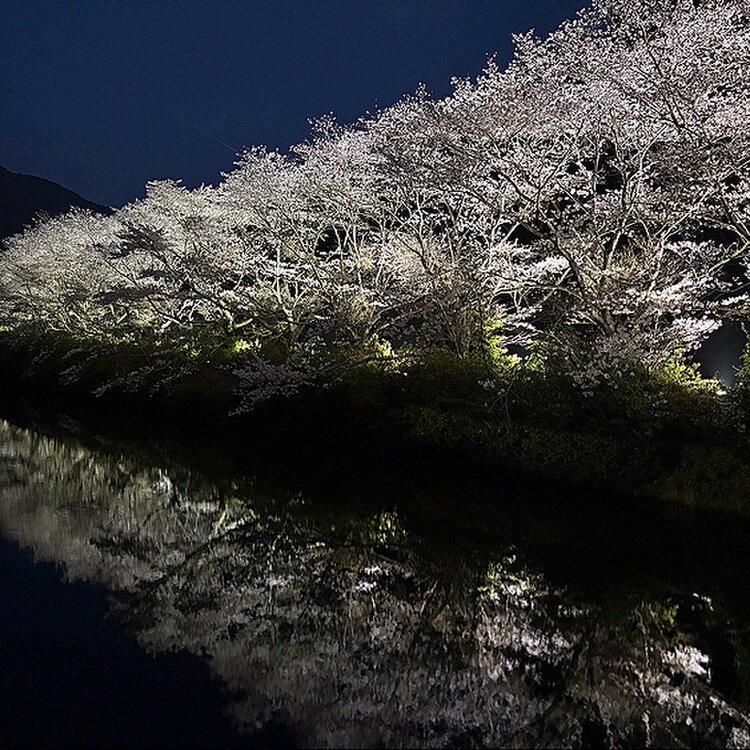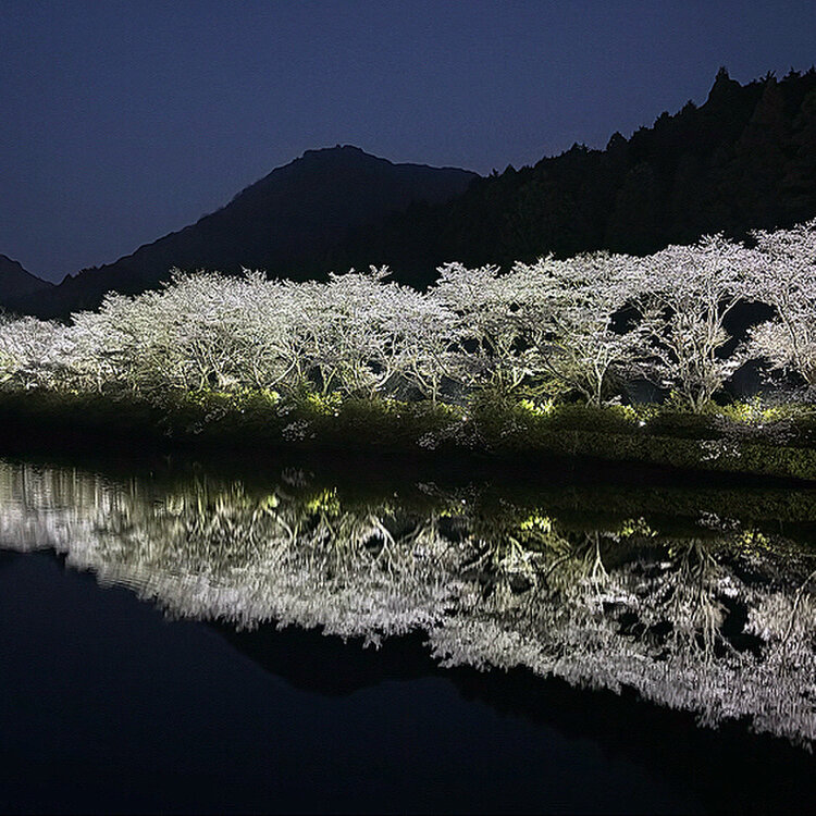 佐賀県武雄市武内町真手野 【赤穂山八天桜のライトアップ】 武雄町内より赤穂山トンネルを抜けると、左側に ある溜池に沿って美しい桜並木があります🌸 リフレクションがとても綺麗でした✨ 4月5日(日)までライトアップ 点灯時間 18:30から21:00まで #赤穂山八天桜 #赤穂山八天桜ライトアップ #桜並木 #リフレクション #佐賀県 #武雄市