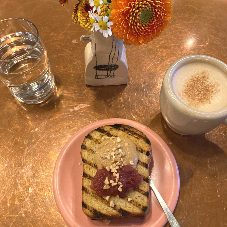 * LOU * 〈 再訪 〉 通りがかるといつも満席の大人気店なので 時間をずらして行ってみたら入れた!が!! お目当てのベーグルサンドは売り切れ‥残念。 アナダマブレッド ピーナッツバター、リンゴとローゼルのジャム ホットチャイ を注文。 何と言ってもストライプの焦げ目が可愛い〜♡ 生地がモッチモチで小ぶりながらボリュームあり。 ピーナッツバターとジャムの相性が良く とっても美味しかったー! 更に甘すぎないホットチャイも大当たり。 他にサラダもあったけど、これだけでは絶対に腹は満たされないと即却下。 が、このサラダが有名のようでちょっと食べてみたくなりました。次回かな。 #中野 #LOU #ホットチャイ #アナダマブレッド