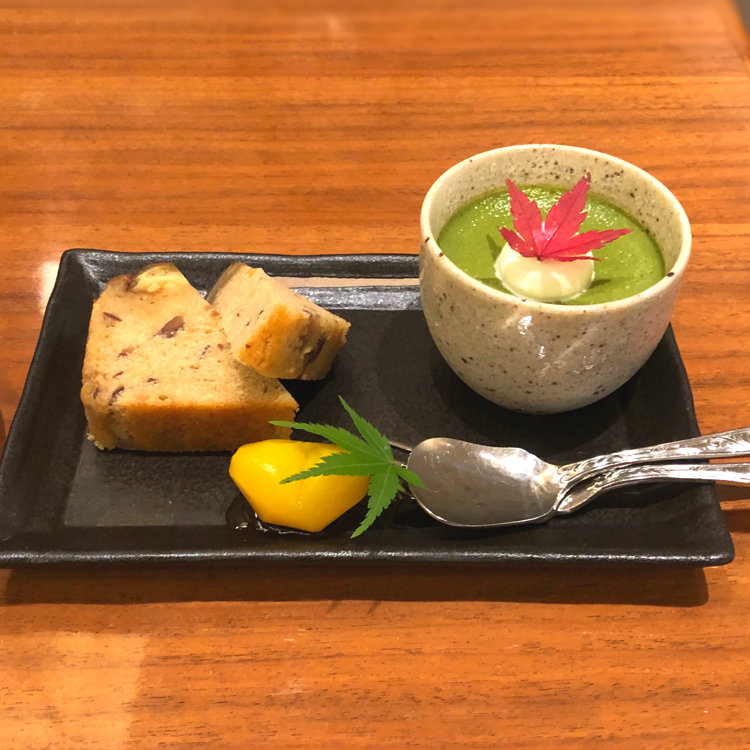 「抹茶プリンと栗のパウンドケーキ」 紅く色づいたもみじと青もみじ🍁 とっても可愛いデザートプレート🌰 #カフェ #デザート