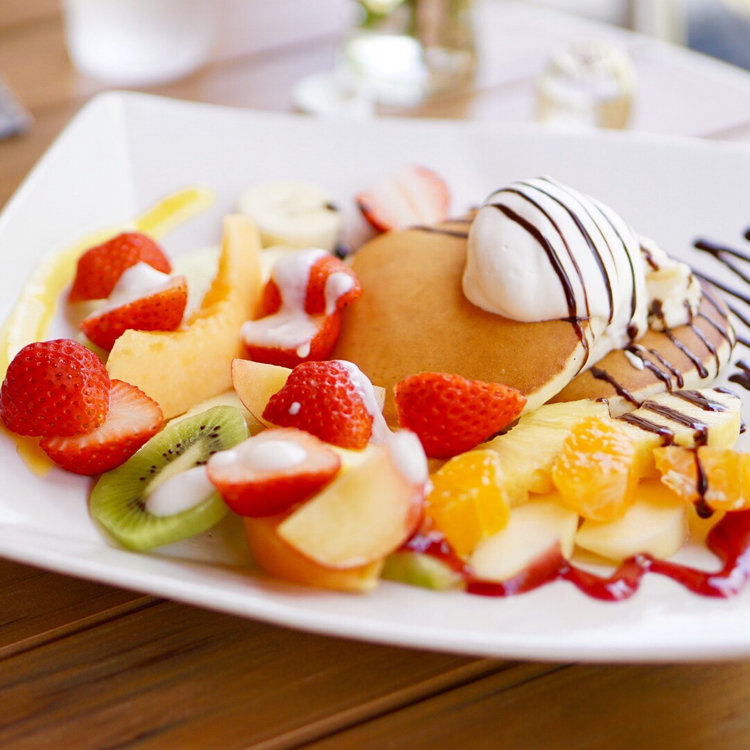 フルーツ盛り盛り、パンケーキふわふわでフルーツ好きにはたまりません。先日全国区のテレビでガレッジセールさんが食レポされてました。