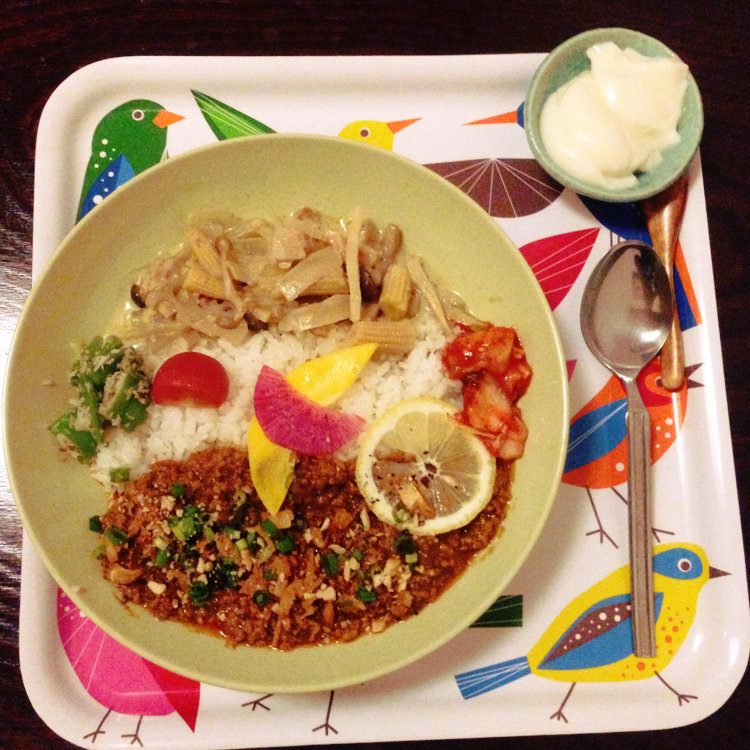 木金はカレーの日!ということで、カレーのみのようです。4種類のカレーから2種類あいがけを選択。グリーンカレーとみそチーズキーマカレーだったかなぁ。