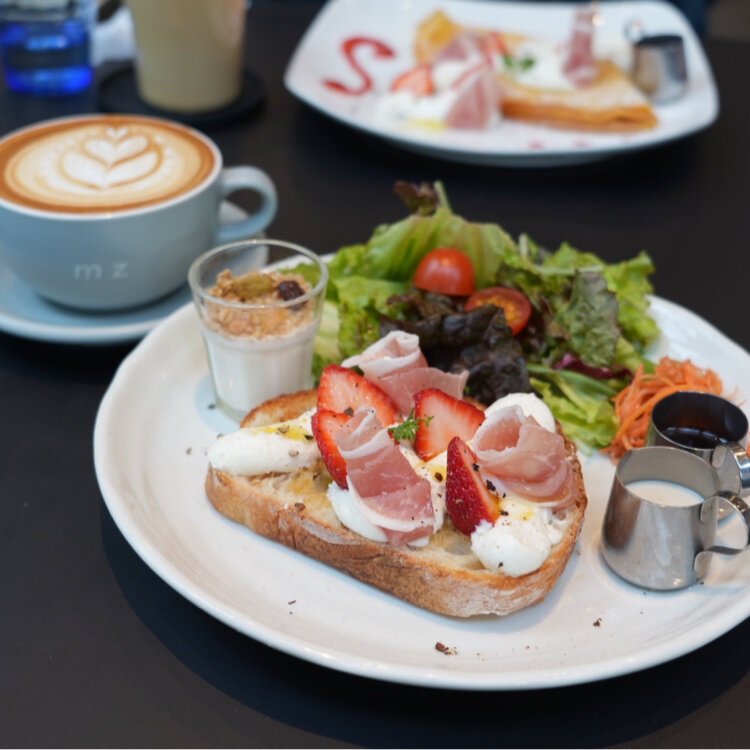 苺のオープンサンドとカフェラテをいただきました☕️🍓オープンサンドの白いクリームは甘くないお食事系のチーズで生ハムも乗っており、お昼ご飯にも良さそうな感じ シロップが付いているのでかけて甘めにも食べられる🌟