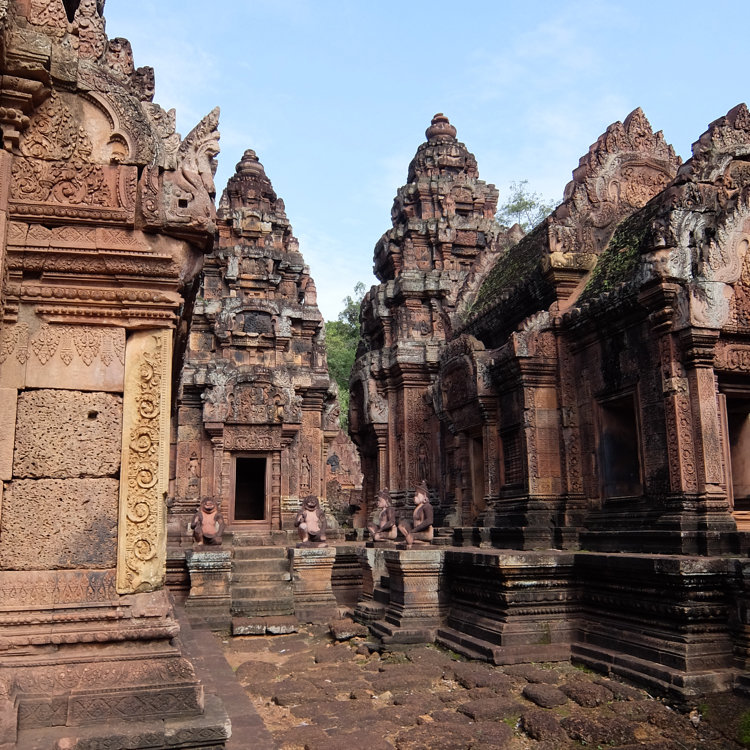バンテアイスレイは女の砦という意味。 北東部に位置しています。 赤い砂岩により建設されていて、歩く道も真っ赤です。 「東洋のモナリザ」は囲いがあるため近くでは見学できなかったのが残念なところ。他の遺跡群から比べると比較的小さめで見学しやすかったなぁ。