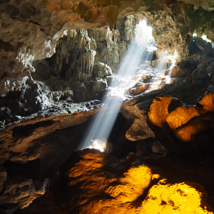 ハロン湾に浮かぶティエンクン鍾乳洞 ハロン湾クルーズで立ち寄った島の階段を登っていくと、かなりの広さの鍾乳洞が!日本で鍾乳洞と言うと寒いイメージがありましたが、ティエンクン鍾乳洞はそんなことはなく、21度ほどあるそうです。(とは言え、外気30度超えなのでかなり涼しく感じました(笑)) ハノイに滞在していたので、バスで3時間揺られ、クルーズで片道1時間とかなり疲れましたが、光が差し込む様子がとても綺麗で行ってよかったです。