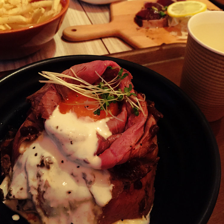 #わたしの街 勝田駅に隣接するキッチン モアナイナのローストビーフ丼!めっちゃ美味しかったです♬左端に写ってるガーリックバターポテトもビールにとても合う味付けで美味しかったです(o^^o)