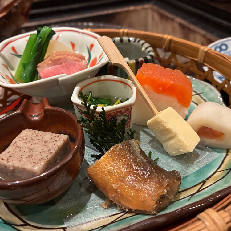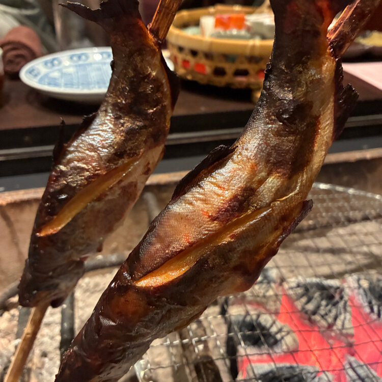 前菜から始まり、お造りは鱒、あまご、岩魚の川魚づくし、お椀、焼物のあまごのしょうゆ焼き、お凌ぎの手打ち蕎麦、強肴の飛騨牛ロースとモモ網焼き、天ぷら、地元産猪鍋、ごはん、デザート…