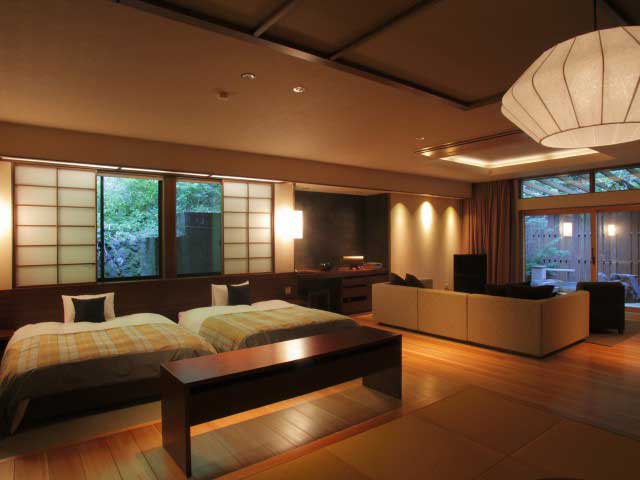 野生のリスや小鳥が訪れる一万坪の森の中に、全室離れの客室と4つの貸切露天風呂が点在する温泉宿。