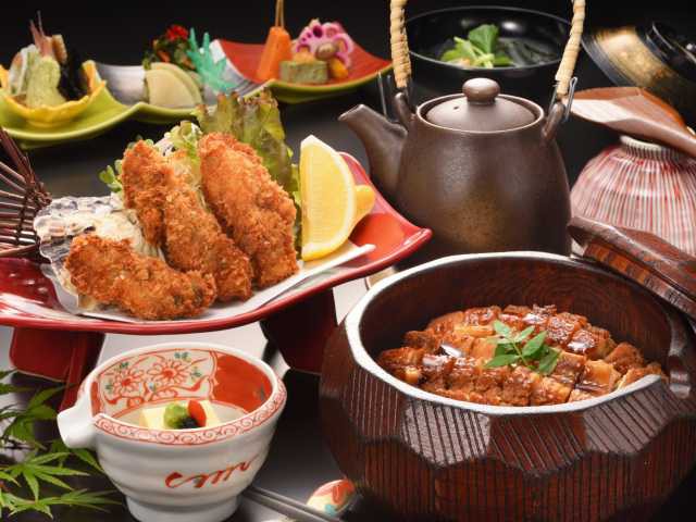 海岸から少し離れた松島湾を見晴らす小高い丘にある。旬の食材を華やかに盛り付け、名物「あなごひつまぶし」、熱々の「究極のかきフライ」などが味わえる。