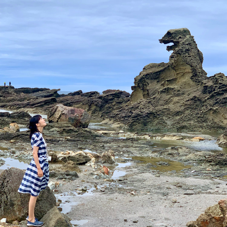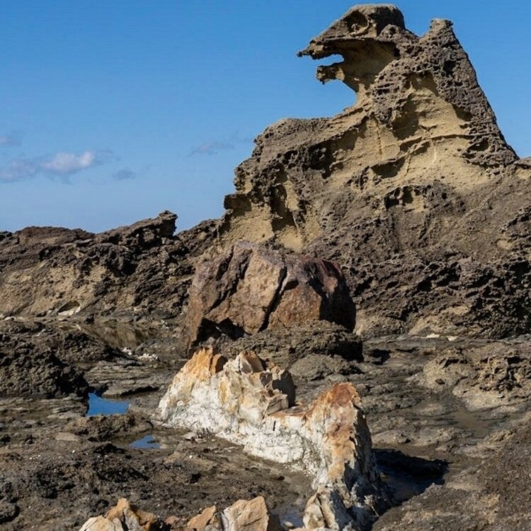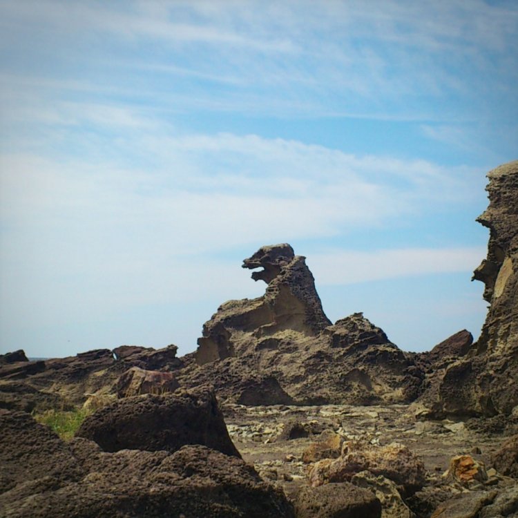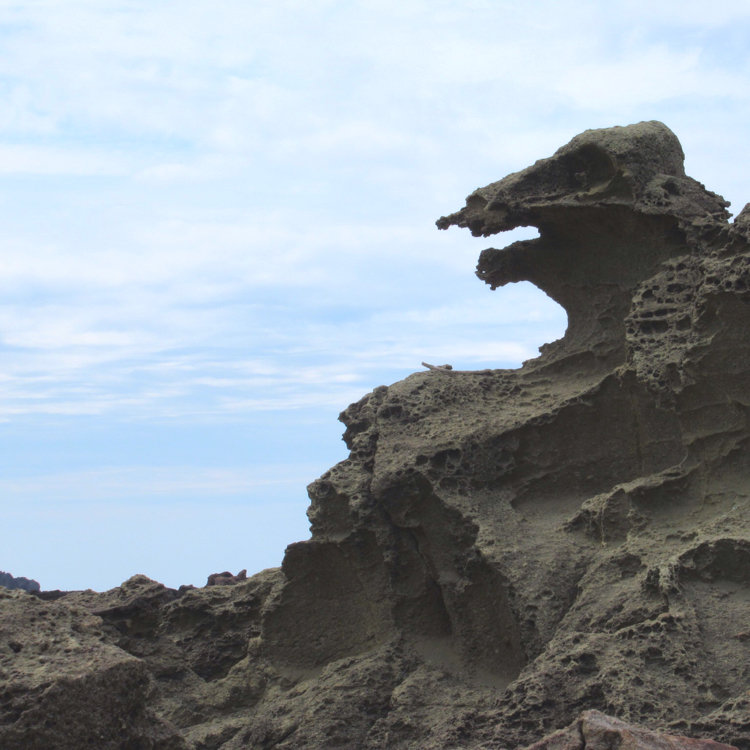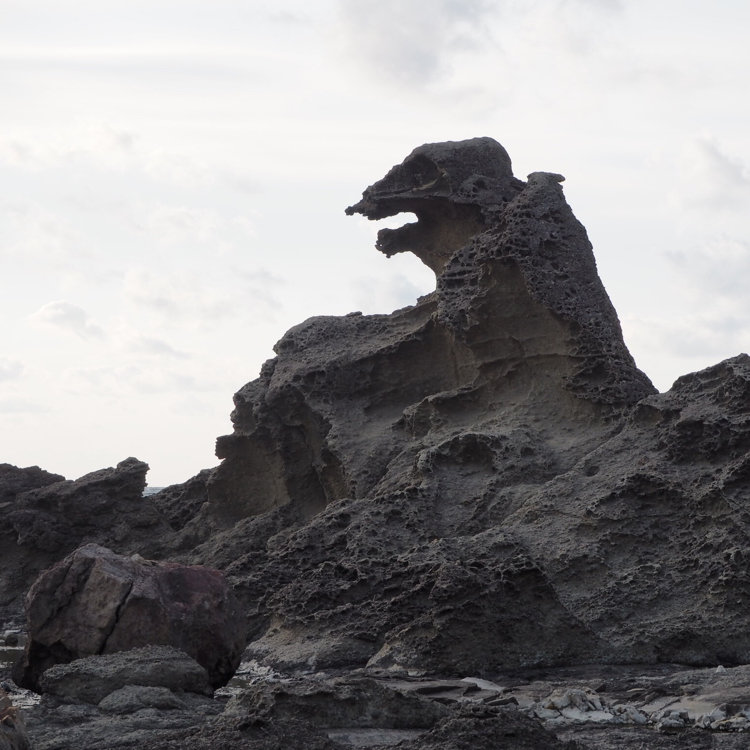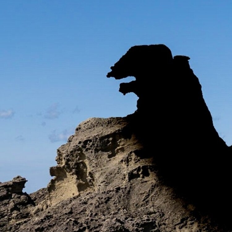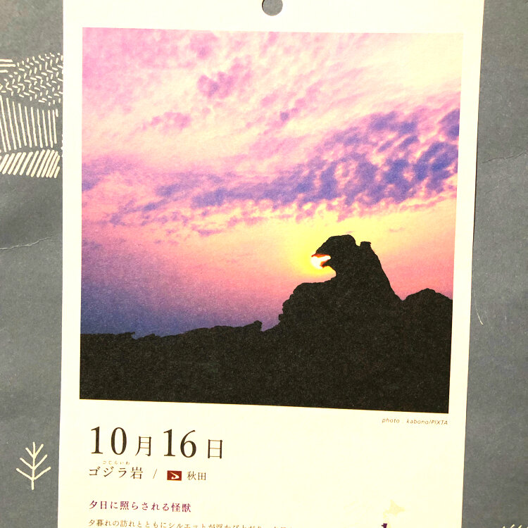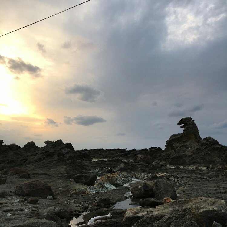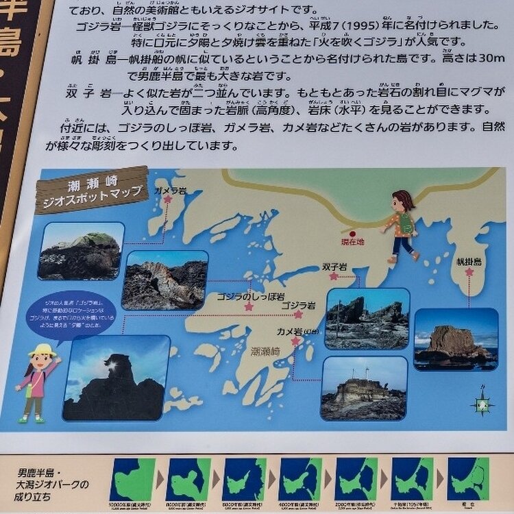 🪨秋田県 男鹿市 潮瀬崎🌞GODZILLAーROCK 館山崎から車で5-10分で着くコチラには、世界で最も有名な怪獣が居ます……🦖 ゴジラです(・∞・)っ🦖 ジャジャジャン!! ジャジャジャン!! ジャジャジャジャジャジャジャジャジャン!! (リズム感全く伝わりませんね🤣🤣🤣) 奇岩、ゴジラ(`・ω・´)いわ! 他にも、“ガメラ岩“や灯台の乗る“亀岩”などが付近にあり、併せて散策いかがですか? (館山崎と潮瀬崎はセットでどうぞ😊) 🔹🔹🔸🔹❀🐦✴ 🔸🔸 ✴🐦❀🔹🔸🔹🔹 【1】右上ゴジラ岩。似てる?? 手前の白い岩は“ゴジラのシッポ岩”だそうです! シッポはリアルꉂꉂ👏 【2】うーん、正直ゴジラにあまり見えなくて🤣 シルエットを塗ってみたら…ゴジラーー‼️‼️ 夕暮時に岩をシルエットにして見るとバッチリですね✨ 上級編は夕陽を口の所に合わせて、火を吹く感じらしいですぞ( ´罒`*)✧ 【4】男鹿半島ができた後に一旦島になり、その後海を埋めるように陸と繋がったのが下の絵で分かりますね☝ 大潟も興味深いですね〜🎶 【5】灯台が立つ亀岩。切り立った崖もあり特徴的ですね。 (2020年11月3日撮影) #秋田県 #男鹿半島 #男鹿市 #潮瀬崎 #ゴジラ岩 #国定公園 #ジオサイト #日本の奇岩百景 #私のことりっぷ #秋日和 #男鹿国定公園 #男鹿半島・大潟ジオパーク ( ´•̥̥̥ω•̥̥̥`)翌日は山形に〜とか考えていて、ふと気付く… あれ?明日ってもう家に着かなきゃならない日じゃ💧 ふー、行き当たりばっ旅は危ない危ない🤣🤣🤣