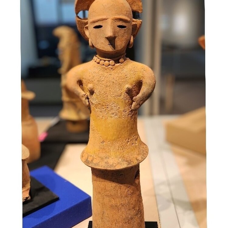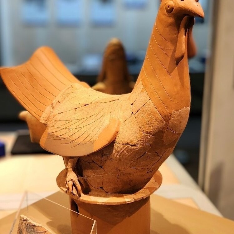 🗾[発掘された日本列島 2024](7/15まで) 去年は会場が甲府だったので迷っているうちに終わってしまったのね😅 今年は千葉だったので行ってみましょう❗ 文化庁が主催して、もう30年くらい続いている恒例の企画展示なのね。 近年の発掘で注目を集めた遺跡や研究の成果などの展示です。 ①オオー(゜ロ゜) 大きなニワトリさんのハニワだこと‼️ 見るからに雄鶏ですわ🐓 高さ 79cm  長さ 71.5cm 群馬県伊勢崎市の古墳(5世紀半ば)から発掘 右羽根の下のグレー🩶の部分が欠損していたので復元したのよね。 この発掘された古墳から約3km離れたところにハニワ工場の遺跡があって、左下にある破片が見つかったんだって。 これが、またニワトリ🐓さんの羽根の欠損部分にピタッとはまった😆 ワー ( ´∀`)/~~ キャーッ このハニワ工場で作ったものじゃん😆 ニワトリ🐓さんを出荷する際、ボキッと折れたんだけど、そのまま古墳へ..... 破片は工場に残る.... ハニワ工場の\(゜ロ\)(/ロ゜)/テンヤワンヤの忙しさが目に見えてくるようだわ。 ②ニワトリ🐓さんの正面 うん?(・_・;? 何かこのニワトリ🐓さんの脚リアルじゃない⁉️ ③脚にズームイン 脚の上に刺みたいなのあるじゃない❗ 調べてみたら蹴爪(けづめ)雄鶏特有なものだった。3月に #今城塚古墳 に行ったときもニワトリ🐓さんいたのよ。写真見たら略した感じの脚だった。 ここのハニワ工場の職人さん、細部までこだわったのね😁😆😁😆 いろいろなところのハニワを見ると違いが分かって面白~い( ^-^)ノ∠※。.:*:・'°☆ 妄想ができて楽しい😃🎵 ④盛装した女性像 この髪型は島田まげっていうの。耳飾り、首飾りしてオシャレしてる ⑤男性像 盛装っていう解説がなかったから、仕事着なのかな? 腰に大刀の剥がれた跡があるようです。 頭に被っているのは兜ではなく、地位を表す布で出来たものなのかな.... #発掘された日本列島 #古墳時代 #ハニワ #埴輪 #ハニワ工場 #はにわ #ニワトリ #雄鶏