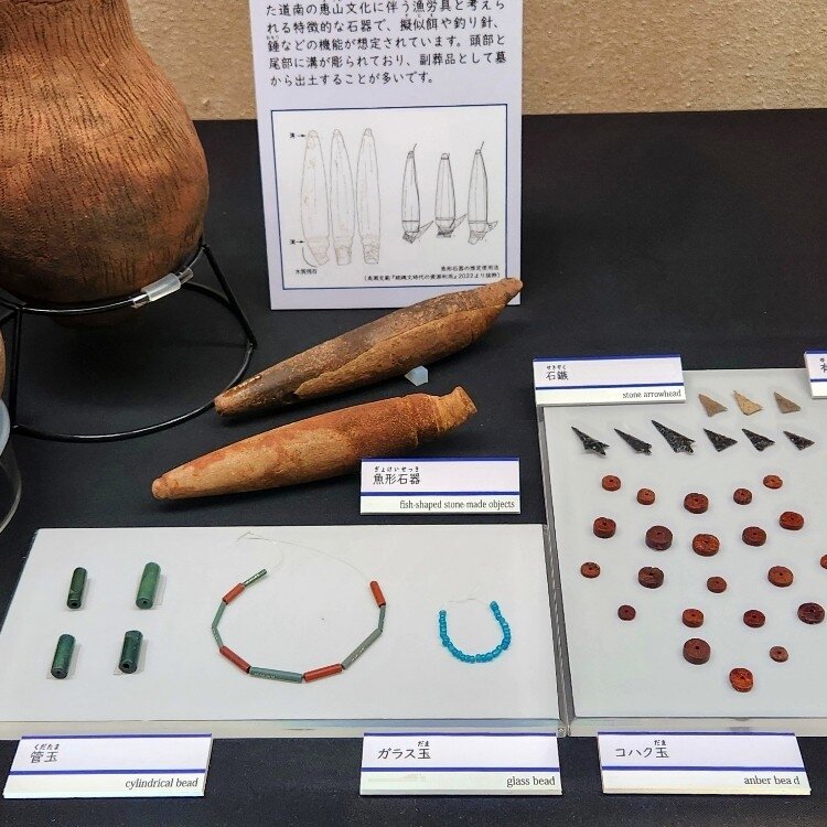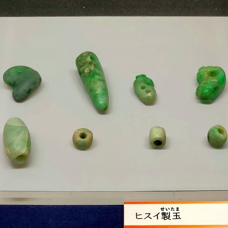 🗾[発掘された日本列島 2024](7/15まで) 〈縄文時代〉の出土品を集めてみました。 ①②やっぱりヒスイはいいなぁ~💕 出土品のヒスイの原産地は新潟県糸魚川地方なんだよね。 これは北海道の遺跡から出土したもの。 糸魚川産ものが北海道まで出回っていたんだ❗ ヒスイは硬玉なので原産地に近い集落に加工工場があった。技術や加工の道具などヒスイの取扱いに慣れた人々じゃないと製品化できなかったみたい。 ③縄文時代にガラス玉ってあったんだ❗ きれいだねー🩵 茶色い玉🤎は琥珀(こはく)、その上は黒曜石の矢尻。先月、黒曜石の原産地を見学に行ったのよ。諏訪産のものは光にあてると透明で美しい~🤩 タモリさんが〈諏訪もの〉と名付けた。 諏訪産の黒曜石なのかな~? これも北海道の縄文遺跡から出土。 日本海側のどこかに縄文の市があったんじゃないかっていう説を、先月行った〔縄文ツアー〕で聞いたのね。北海道からも来ていたのかなー すごいじゃない⤴️⤴️ 今度はヒスイツァーに行きたいわ~😆 ④耳栓(じせん) .....というプレートがあったけど、〈みみせん〉?(・_・;? 縄文の耳栓.....何に使ったの❓️ 耳飾りではないみたい.....初めてお目にかかります。何に使ったのか研究者の人にきいてみたかった..... #発掘された日本列島 #縄文時代 #ヒスイ #翡翠 #黒曜石 #矢尻 #琥珀 #ガラス玉 #縄文人