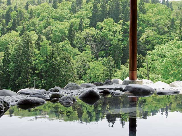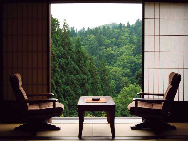 白銀の滝を眼前に望む温泉旅館。滝は夜になるとライトアップされ、幻想的な雰囲気になる。蕎麦の宿とうたうように、手打ちそばが好評で、夕食にはそば料理が必ず並ぶ。